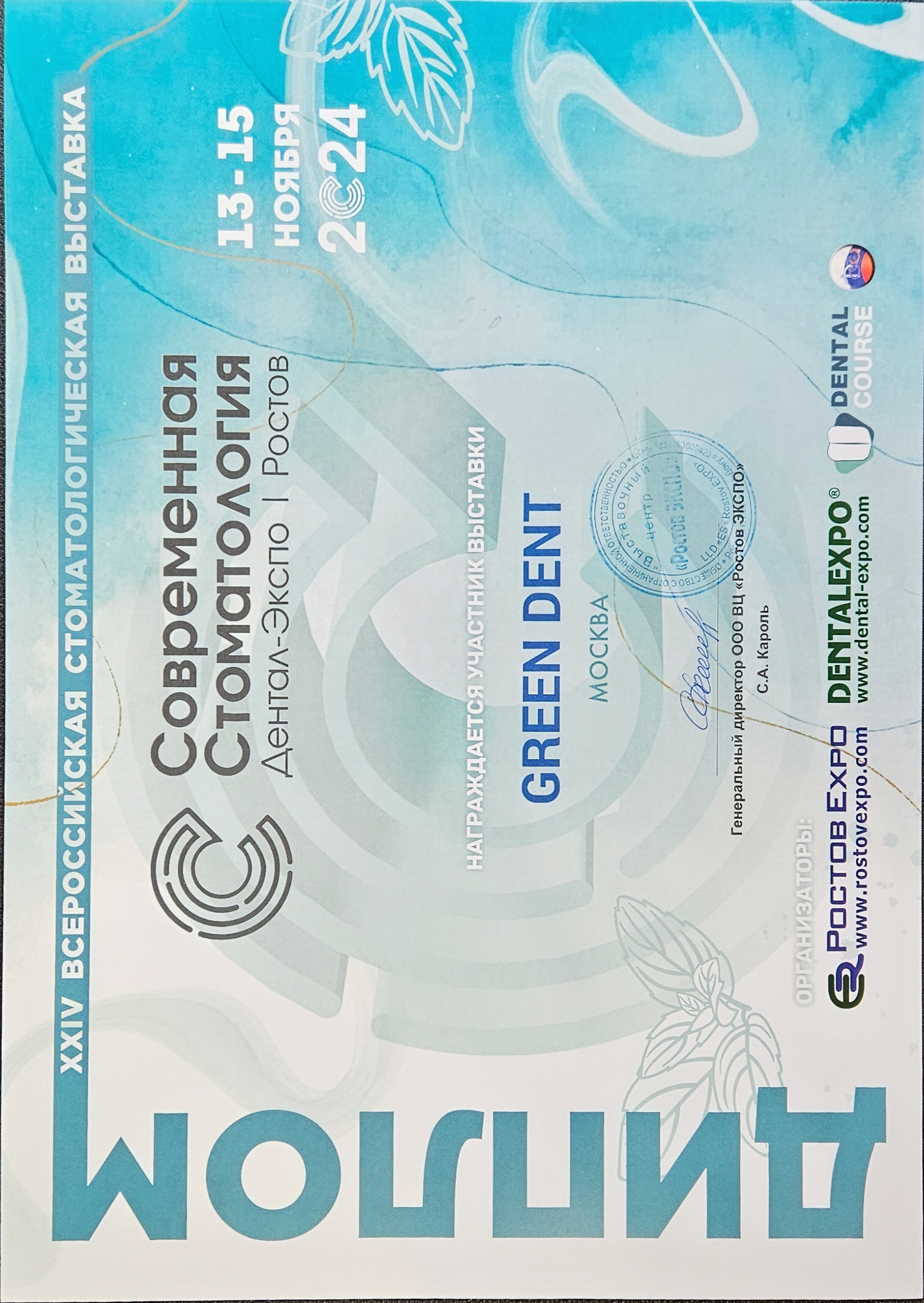 Организаторы настоящим удостоверяют, что компания GREEN DENT являлась участником международной выставки «Дентал-Экспо Санкт-Петербург»