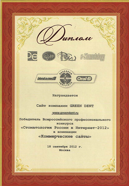 Диплом Победителя конкурса "Стоматология России в Интернете-2012"