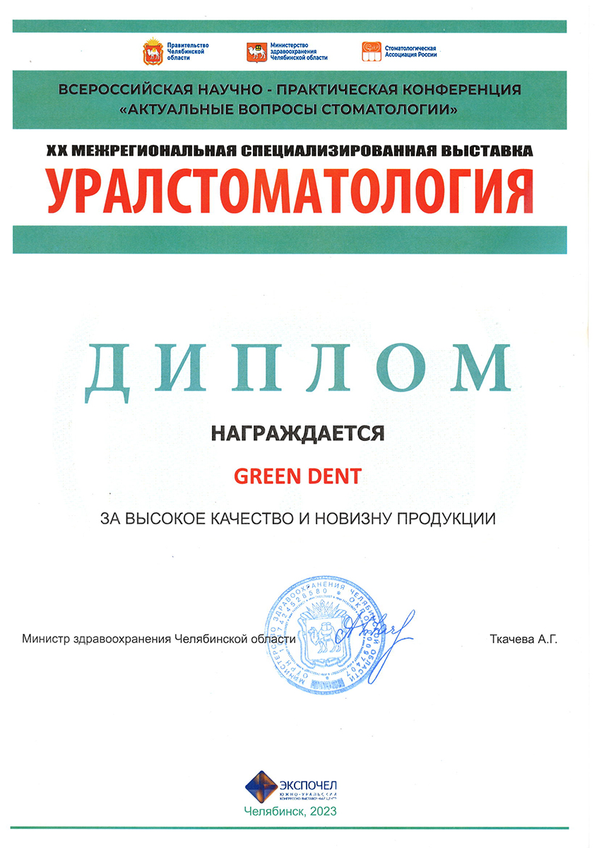 Диплом GREEN DENT за участие в 32-й международной выставке медицинской техники, изделий медицинского назначения и расходных материалов «ЗДРАВООХРАНЕНИЕ-2023»